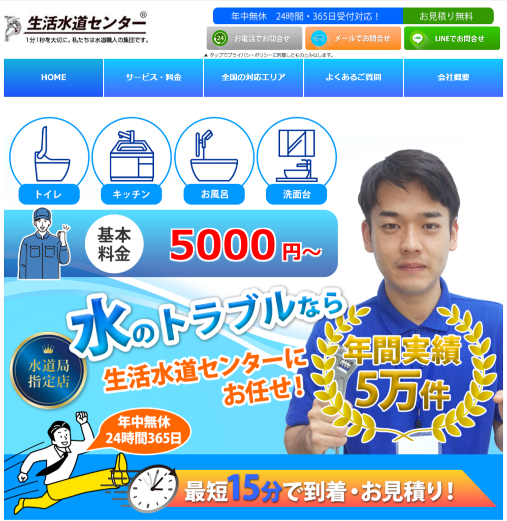 トイレ・キッチン・お風呂・洗面所など、住宅内の水道設備全般に対応しており、24時間365日いつでもご相談いただけけるそうです。