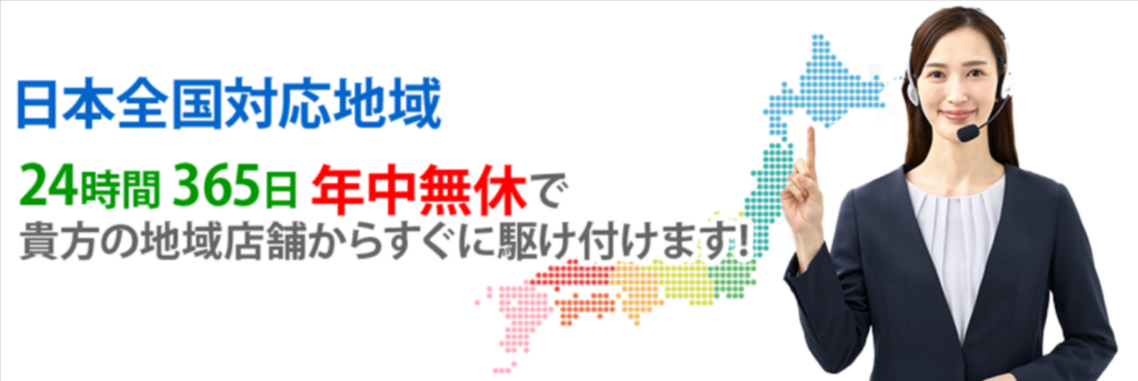 全国の主要エリアに対応しており、現地スタッフが駆けつけ対応するそうです。
