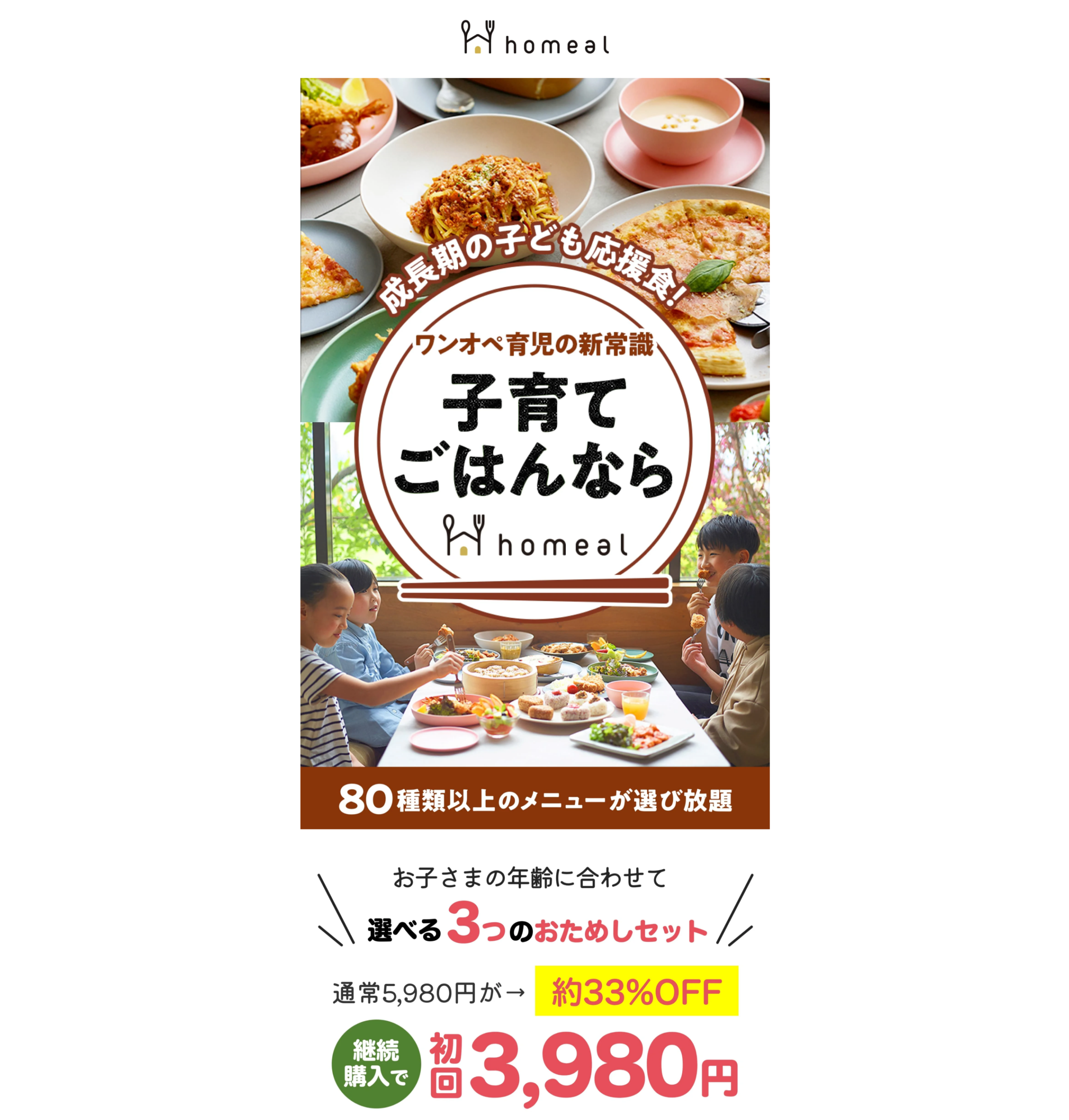 【PR】homeal ホーミール 詳細はこちらをクリック 小さな子どもから大人まで、家族みんなにちょうどいい ハーフサイズの栄養新常食【累計80万食突破!】低塩分・高栄養・美味しさを兼ね備えた「家族向けウェルネスフード」をコンセプトに、60種類以上のメニュー豊富な宅配サービスがhomealです。ワンコインかつハーフサイズ中心のメニューラインナップが「家族思い・健康志向・ナチュラル・子育て中のママパパ・」に大好評!わたしも美味しい/家族も美味しいというサービス体験をどうぞお楽しみください。 商材名 homeal ホーミール運営者 HN※当サイトはアフィリエイトプログラムを利用し宣伝目的で作成しております。