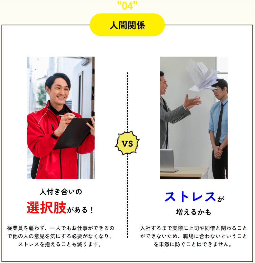 生命保険会社で長年管理職として働いてきましたが、50代後半になりそろそろ定年後のことを考えなくてはと思っておりました。 60歳になると再雇用となり収入も大きく下がることから、以降も一線で働ける仕事を探していたところ、タイミングよく会社が希望退職者を募ったため思い切って応募しました。独立後はバイクで15分以内の近隣で仕事をしており、昼食も夕食もほとんど自宅で取れていて生活のリズムもサラリーマン時代よりも良くなりました。 繁忙期は朝から夜間まで仕事漬けになりますが、逆に予定をしっかりとれば休みは自由に取れますので、旅行に行ったり、好きな歌舞伎やコンサートなどにもちょくちょく出かけています。 何より自分でスケジュールを決められるのが一番です。なお、毎日体を使って仕事をしているので、メタボも解消、20年ぶりに行った健康診断もALL、OKです!