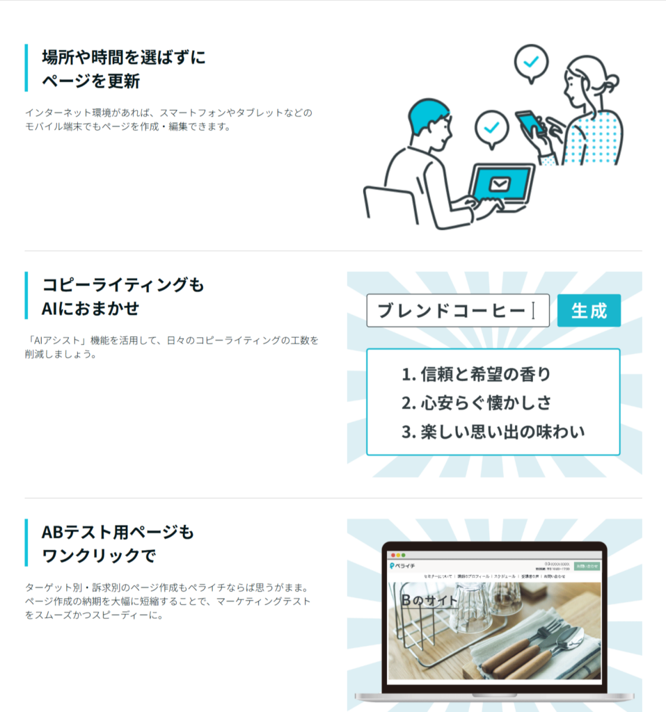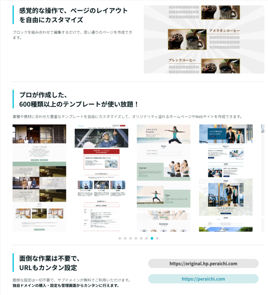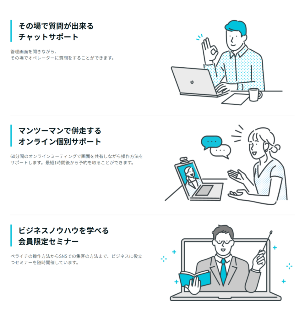 ・ホームページ作成から予約・決済・顧客管理まで、ペライチ一つで完結するそうです。