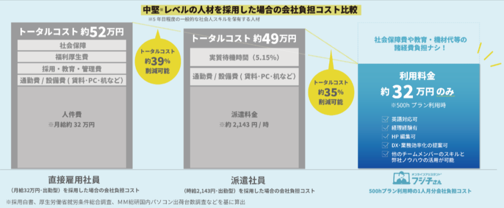 中堅レベルの人材を採用した場合の直接雇用・人材派遣コストと比較するとコスト削減可能とのことです。