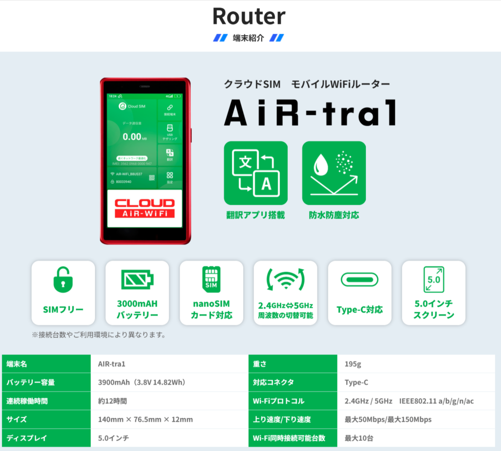 世界135ヶ国で使えるクラウドSIMを採用しているそうで、