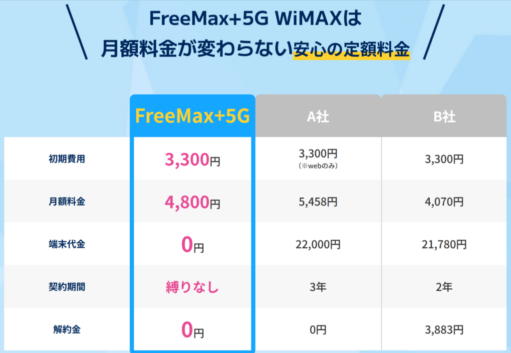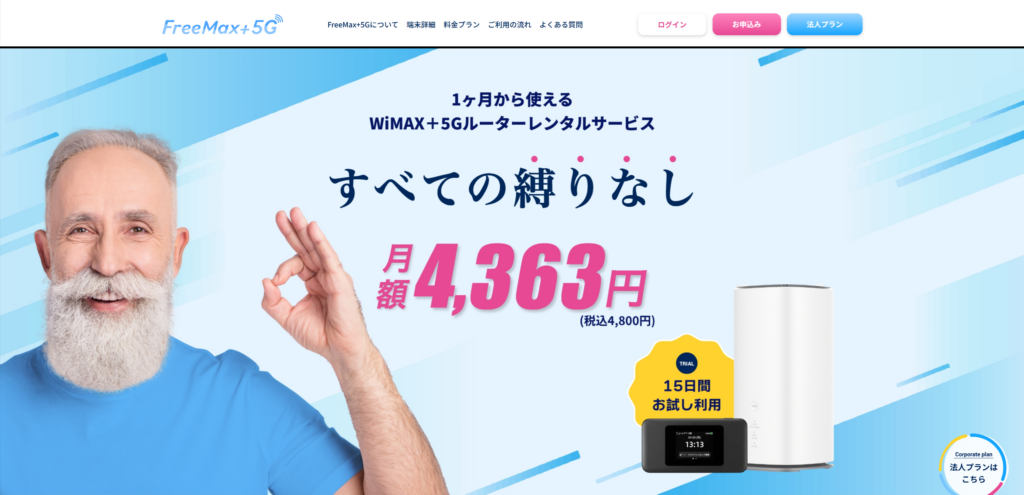 【PR】FreeMax+5G 本日は新登場!契約期間の縛りもデータ容量の制限も一切なし!月額4,800円(税込)のワンプラン【WiMAX+5Gレンタルサービス】のご紹介です。◆おすすめポイント◆◇データ容量制限なし!1日〇〇ギガの制限なども一切ありませんので、SNSや動画の視聴、テレワークでのオンラインミーティングなどを実質無制限でご利用いただけるようです。◇契約期間の縛りなし!WiMAXのレンタルサービスでよくある、〇ヶ月(〇年)以内の解約時に発生する違約金などは一切不要なので、必要な時だけ利用できるのが特徴のようです。◇15日間のお試し利用OK!当サービスをはじめてご利用される方限定!端末受け取りから15日以内の解約申請・端末返却で月額費用+オプション費用を全額返金するそうです。WiMAXの通信状況に不安がある方でも安心して利用出来るサービスとなっているようです。◇端末はレンタル品なので、解約時の端末代金も0円!弊社が提供する端末はレンタル品になりますので、解約時の端末代金も一切不要のようです。◇平日14時までのお申込みで即日発送!さらに発送料金は0円のようです!お申込みは全てWEBから!14時までのお申込みで即日発送ができます。配送時にかかる発送料金は全て弊社が負担するので、すぐに使えてストレスもないようです。◆こんな方にピッタリ◆・家でも外でもインターネットを制限なしで利用したい方・開通工事の手間をかけずに大容量のインターネットを利用したい方・動画やSNSを思う存分利用したい方・月々の通信費を安く抑えたい方 15日間お試しOK! ・はじめてWiMAXで繋がるか不安 …・WiMAXを持ち運びで使ってみたい!・WiMAXが固定回線の代わりになるか?・WiMAX5Gの速度を体感してみたい! 料金詳細 【POINT01】月額4,800円/月(税込み)【POINT02】初期費用3,300円/初月のみ(税込み)【POINT03】契約期間の縛りなし 解約違約金0円【POINT04】端末代金0円【POINT05】発送料無料 WiMAX+5G最新機種が 端末代金¥0でレンタルできます モバイルルーター:speed wi-fi dock 5g重量:約198gサイズ:約W140×H72×D15.3mmWi-Fi規格:IEEE802.11b/g/n/ax(2.4GHz)IEEE802.11a/n/ac/ax(5GHz)最大通信速度:下り速度 最大3.5Gbps上り速度 最大286Mbps最大接続台数:48台(5GHz:28台+2.4GHz:20台)充電ポート:USB 3.0 Type-Cバッテリー容量:5,400mAh※在庫状況により端末の種類が異なる場合がございます。※出荷時に入念な通信チェックと端末のクリーニングを実施したリフレッシュ端末を発送いたします。※モバイルルーターには充電用USBケーブルは付属しておりません。お客様でご準備いただくか、別途ご注文時ご購入いただけます。 ホームルーター:Speed Wi-Fi HOME 5G L13重量:約635gサイズ:約W100×H207×D100mmWi-Fi規格:IEEE802.11b/g/n/ax(2.4GHz)IEEE802.11a/n/ac/ax(5GHz)最大通信速度:下り速度 最大4.2Gbps上り速度 最大286Mbps最大接続台数:[Wifi]32台 / [有線LAN]2台電源ポート:専用AC付属品:専用ACアダプター※在庫状況により端末の種類が異なる場合がございます。※出荷時に入念な通信チェックと端末のクリーニングを実施したリフレッシュ端末を発送いたします。 商材名 FreeMax+5G運営者 HN※当サイトはアフィリエイトプログラムを利用し宣伝目的で作成しております。